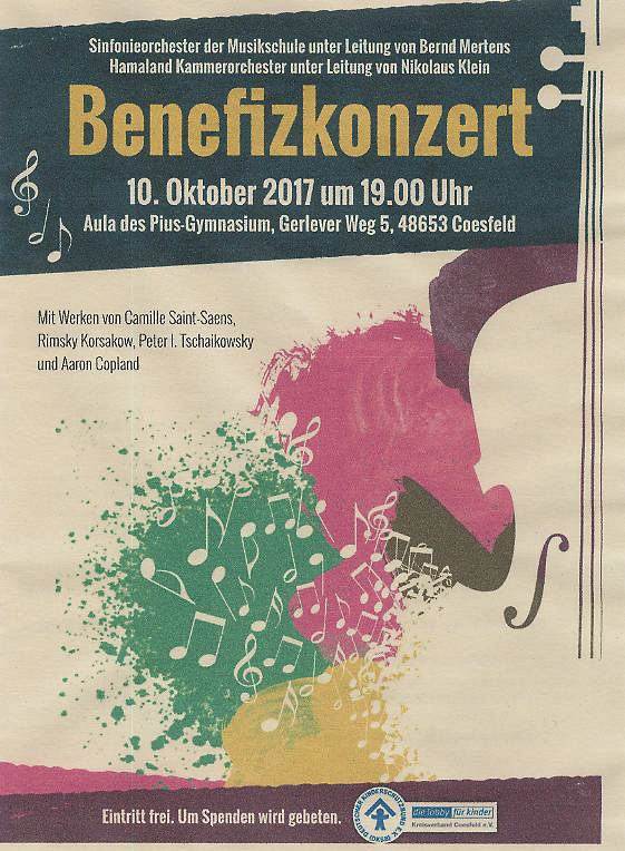 Am 10. Oktober 2017 trafen sich das Sinfonieorchester der Musikschule Coesfeld und das Hamaland Kammerorchester zu einer Wiederholung ihres gemeinsamen Konzerts vom Juni in der Aula des Pius-Gymnasiums wieder. Diesmal zu einer Benefiz-Veranstaltung für den Kinderschutzbund des Kreises Coesfeld e.V.
